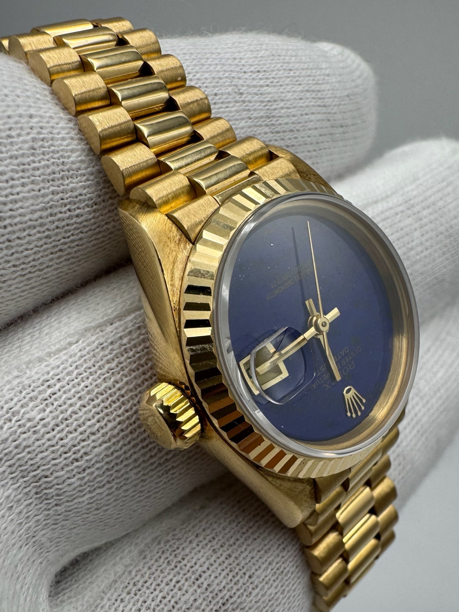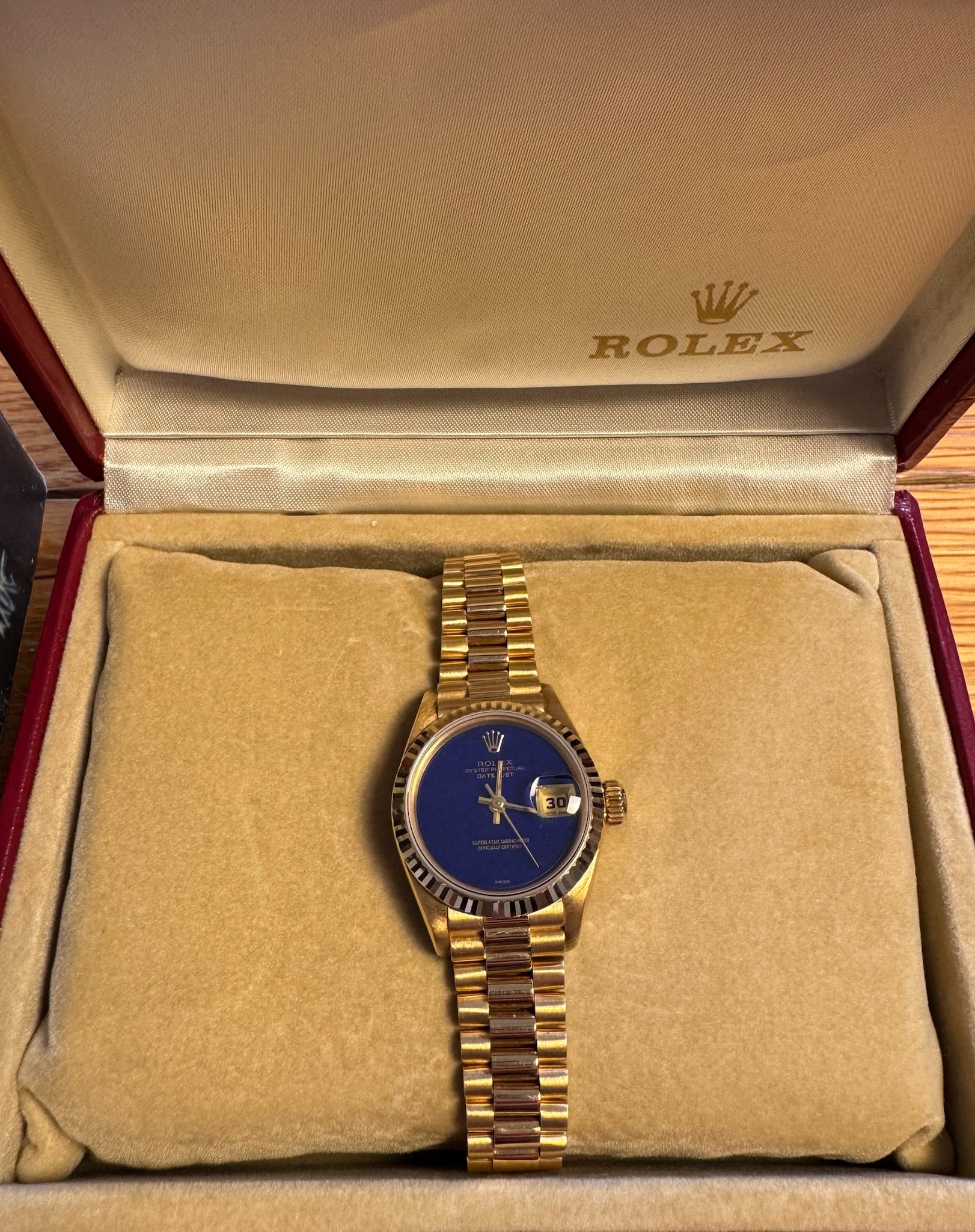 The standout feature of this watch is its Rolex factory Lapis Lazuli dial, which is in flawless condition—free of cracks or imperfections. The deep blue stone, unique to each piece, offers a captivating contrast against the gold case.