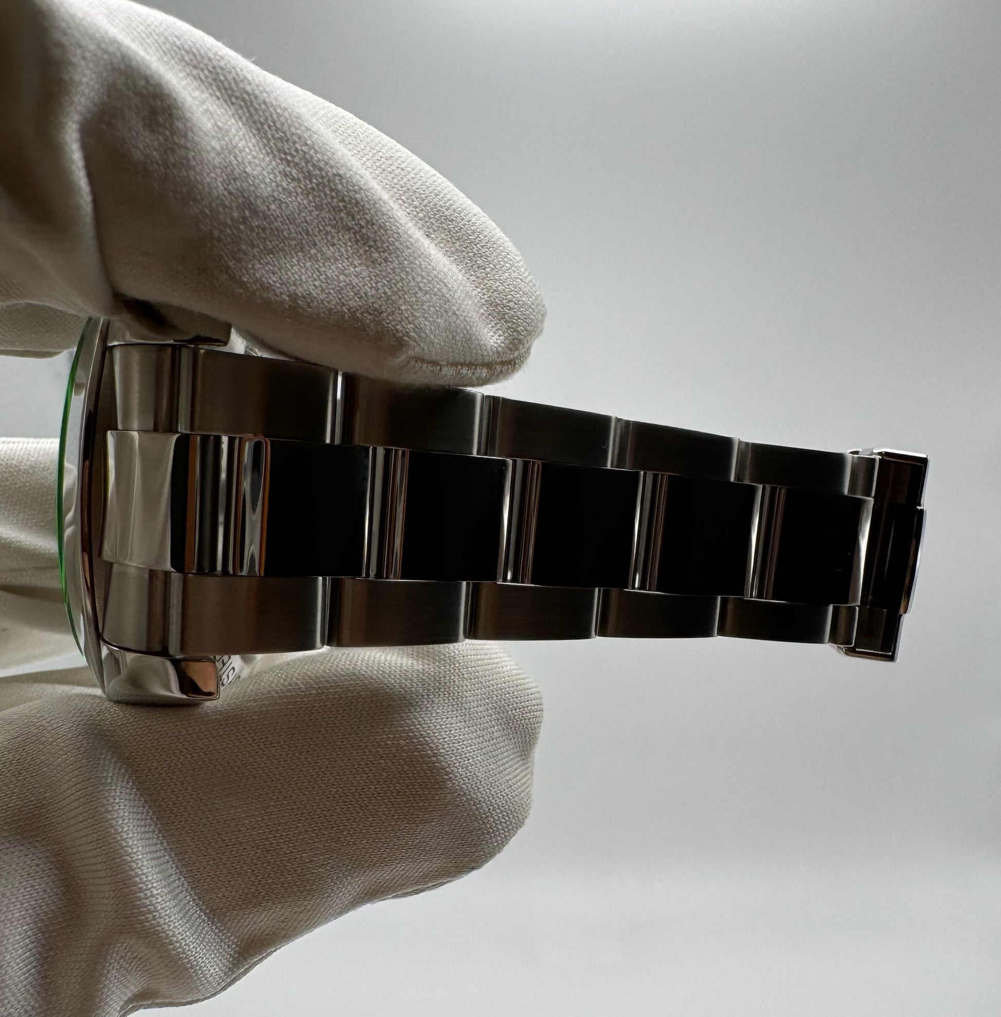 The black dial is flawless, and the signature green crystal remains in top condition. The bracelet, with 11 links (missing just one), shows no stretch, reflecting minimal wear.