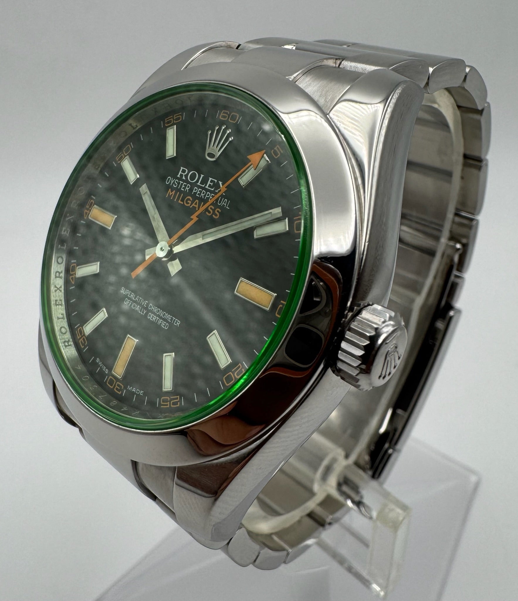 This Rolex Milgauss 116400GV is a highly sought-after model, known for its unique design and the distinctive green crystal, which adds to its collectability since the model has been discontinued. The watch is in excellent all-original condition, featuring thick lugs and sharp factory edges.