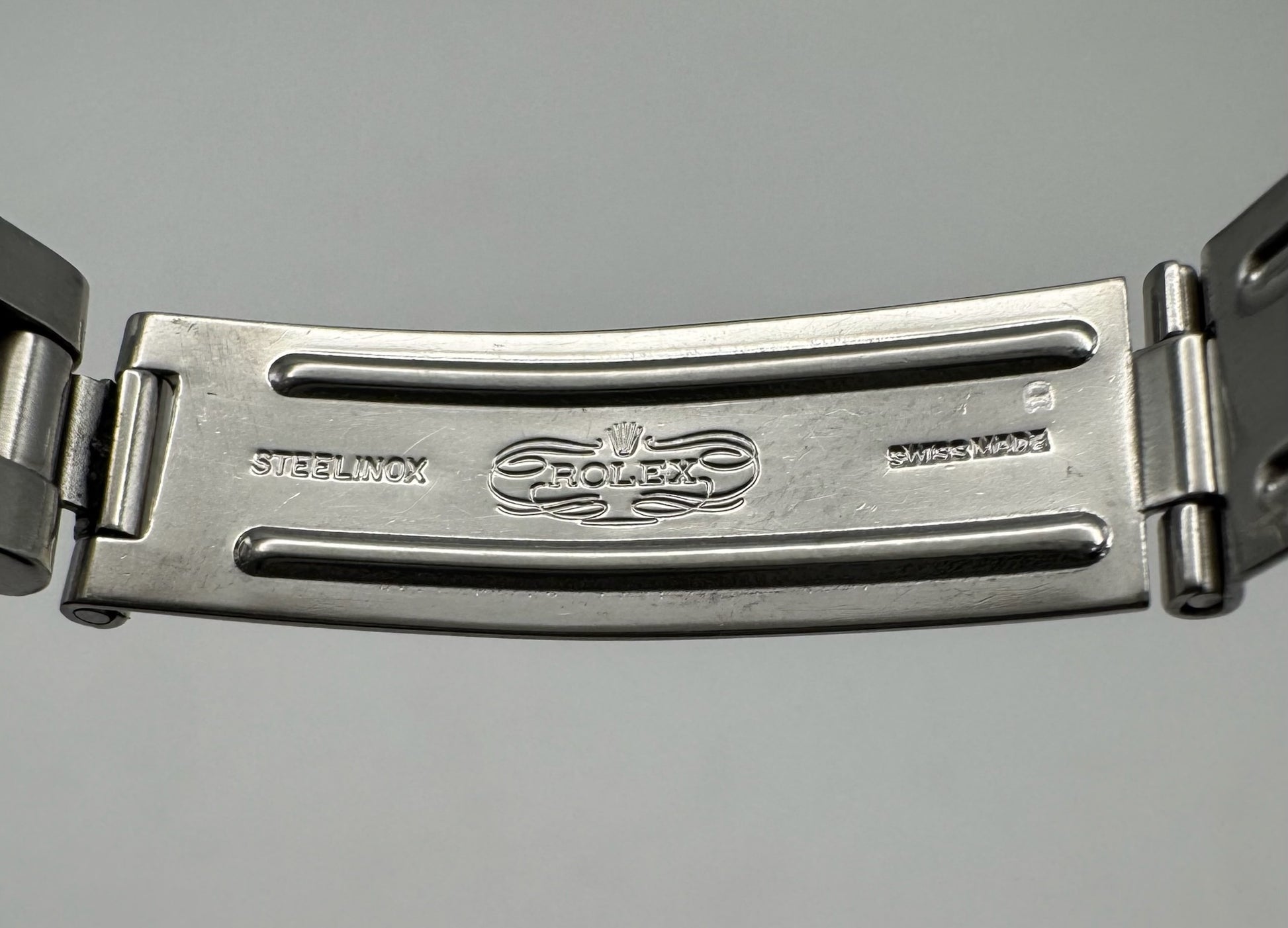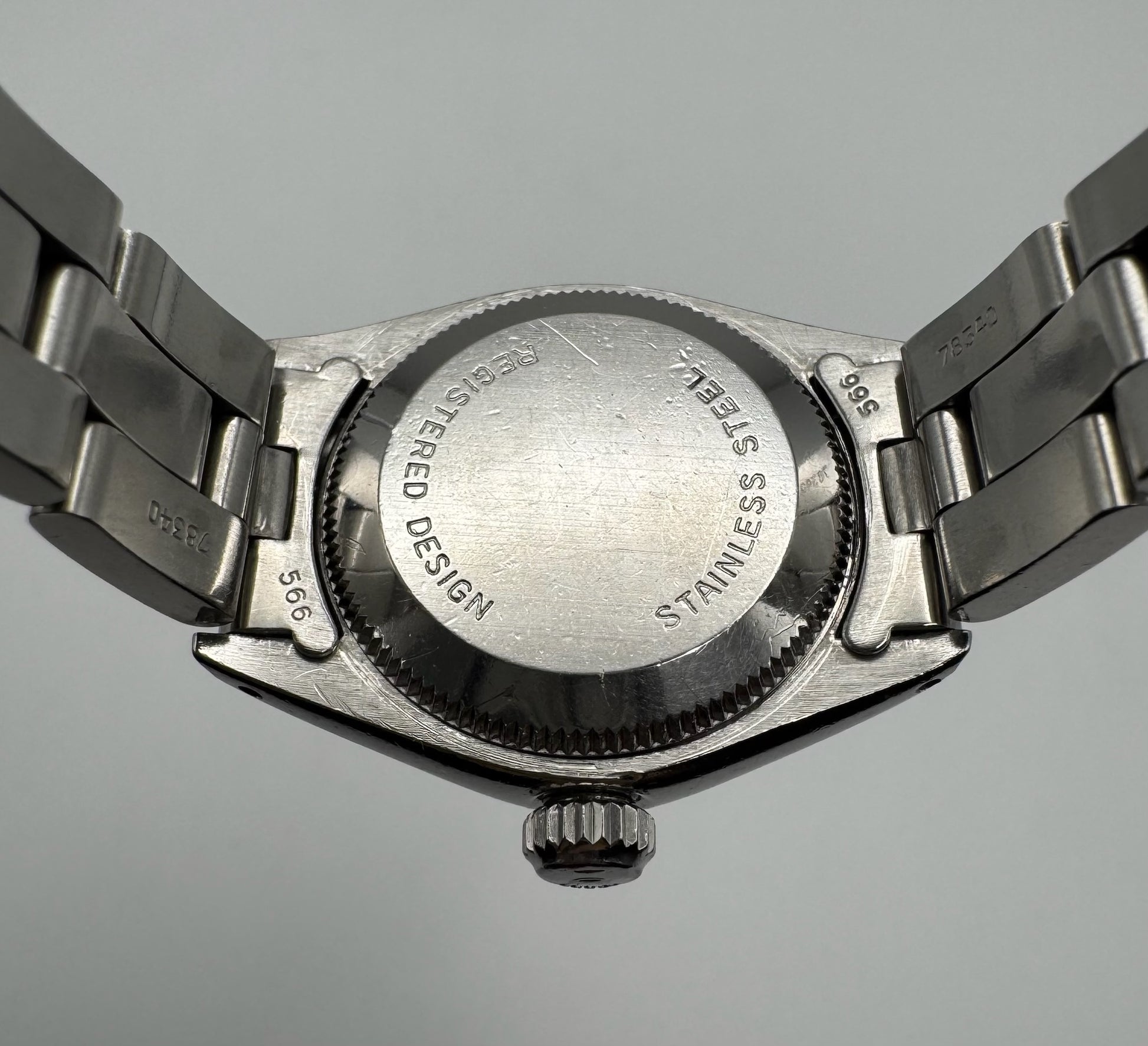 This Rolex Oyster Perpetual Lady Ref. 6718 is a 26mm stainless steel example presented in original, unpolished condition. The case shows honest signs of wear consistent with age while retaining its factory finish, with thick and well-defined lugs that highlight its originality. All case engravings remain crisp and fully legible, with a 5.6 million serial number dating the watch to approximately 1978.