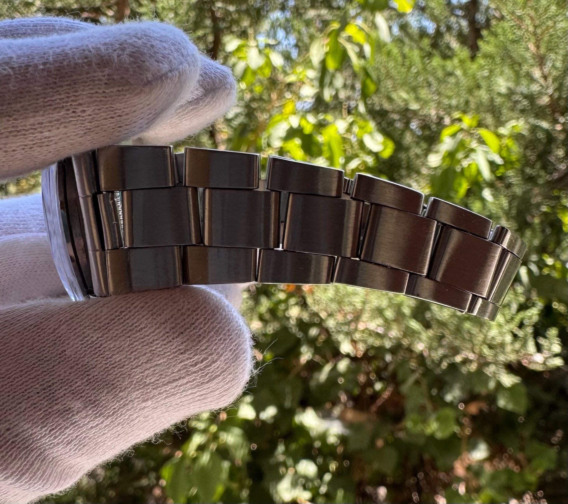 Its original dial has developed a warm creamy patina, shifting toward a yellow hue in natural light, complemented by the matching original hands for a cohesive look. The bracelet remains in excellent shape, exhibiting minimal stretch while retaining all 12 links—an uncommon detail for a watch of this age.