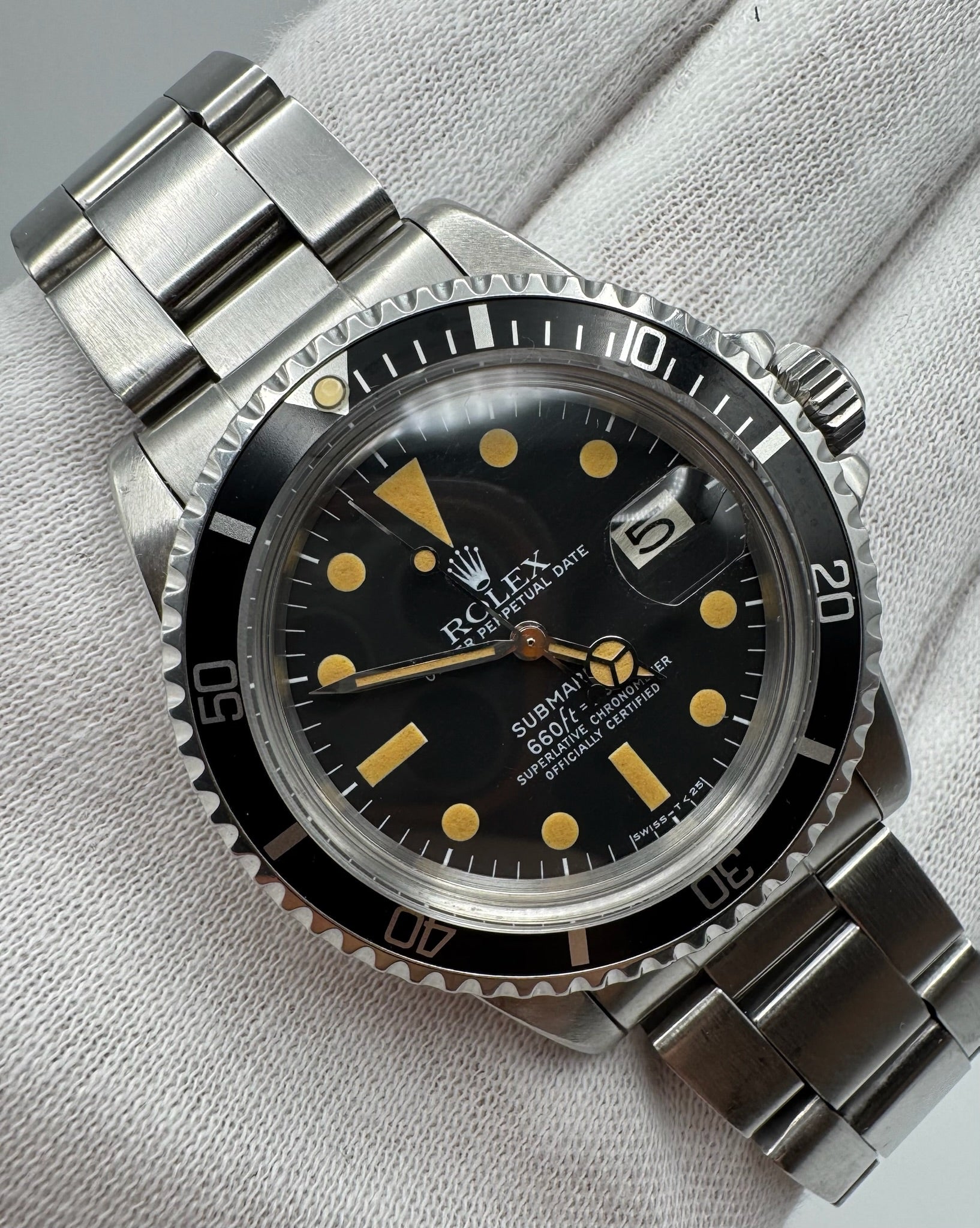 The Rolex Submariner Ref. 1680 is a celebrated vintage diver’s watch that showcases the enduring craftsmanship and utility Rolex is known for. This 1981 example is in very nice condition, with a case that features thick and sharp lugs, possibly polished long ago but retaining strong lines and structure.