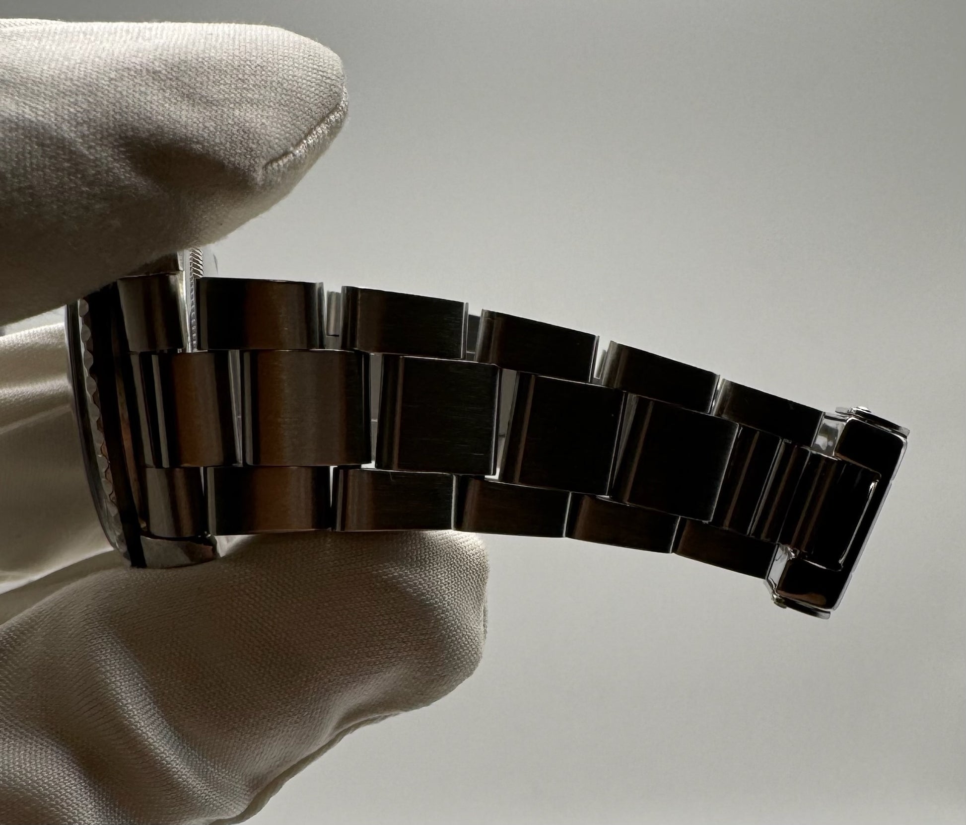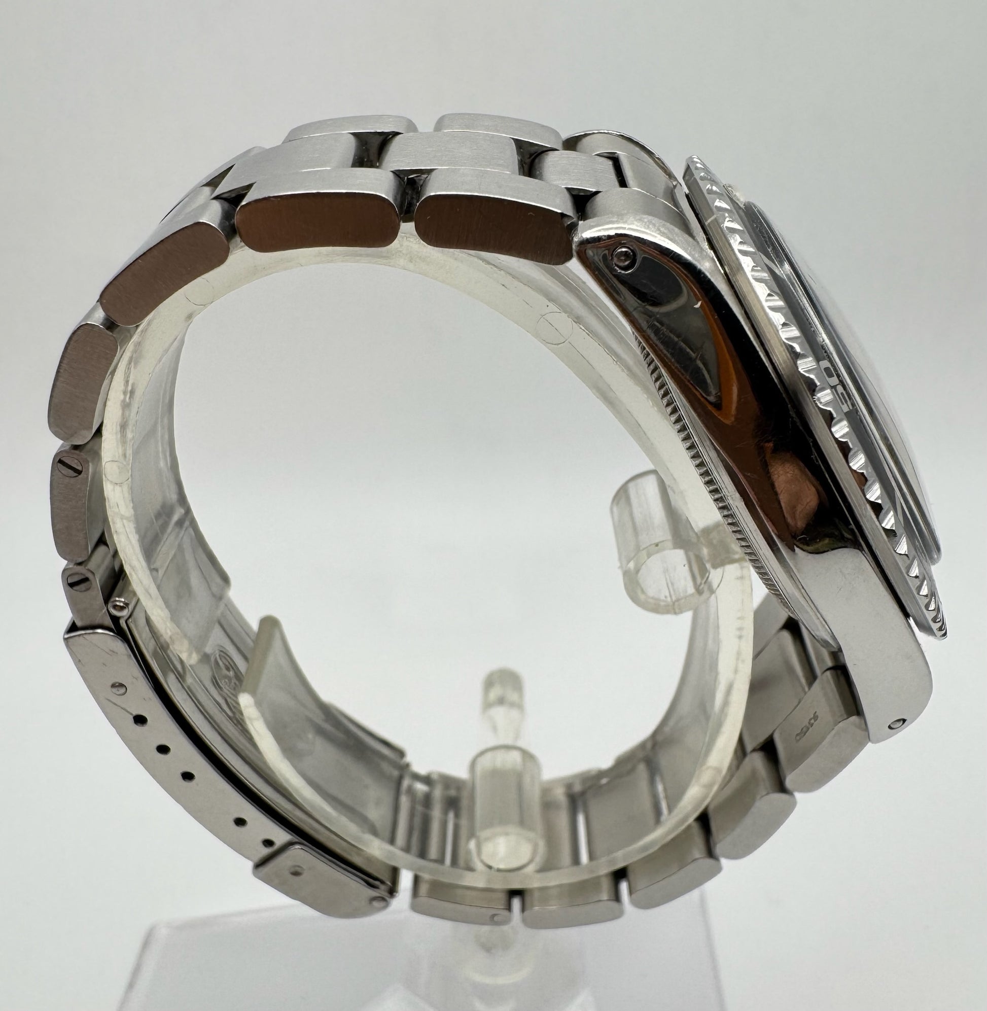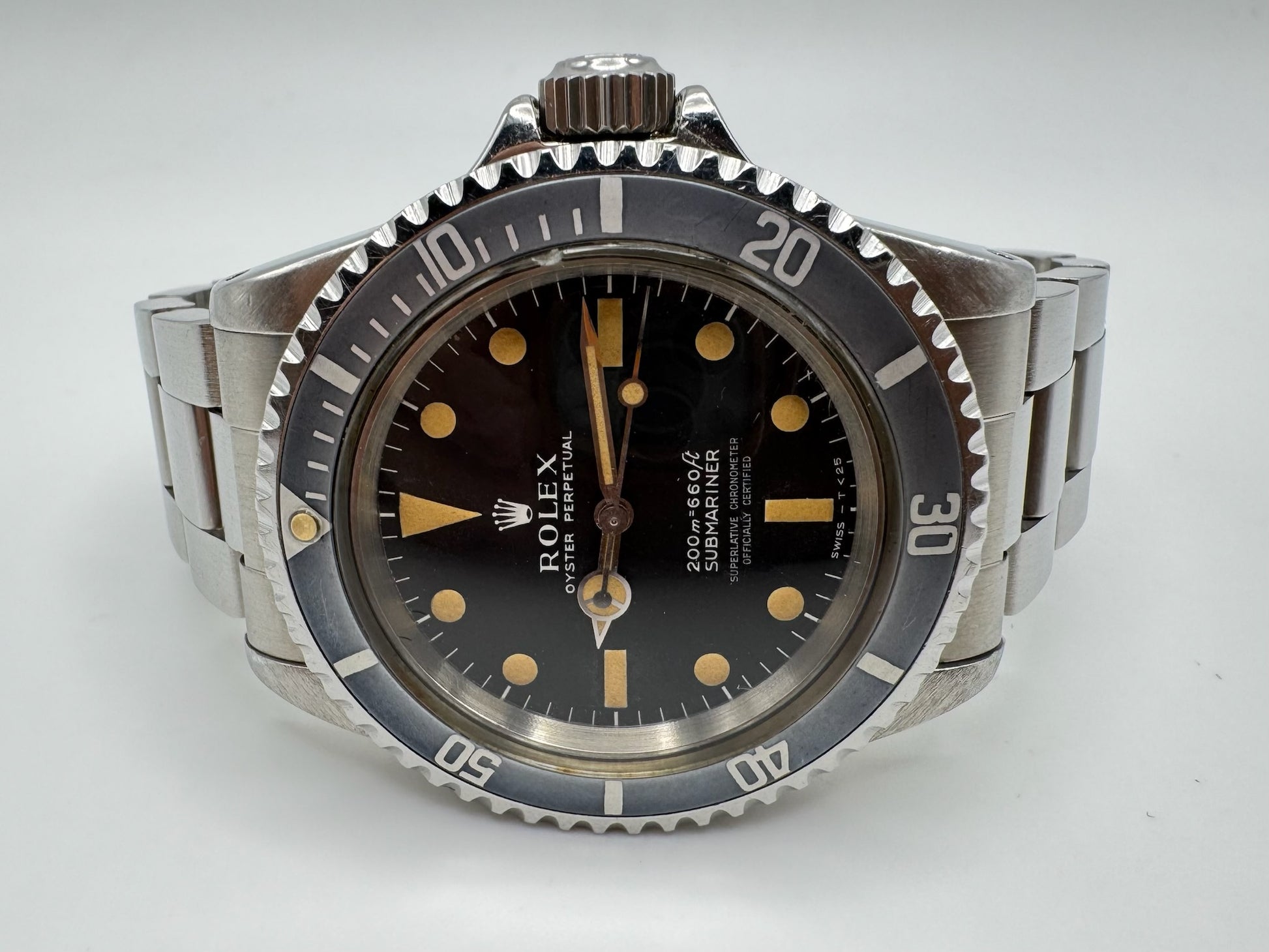 The case is in excellent condition, featuring sharp lugs and edges. The included oyster bracelet is a later model, providing greater solidity than the original riveted versions, and it comes with the original 580 end links, specifically designed for Submariner models. The case reference, serial, and all numbers remain clearly visible, and the case back is stamped 1967.