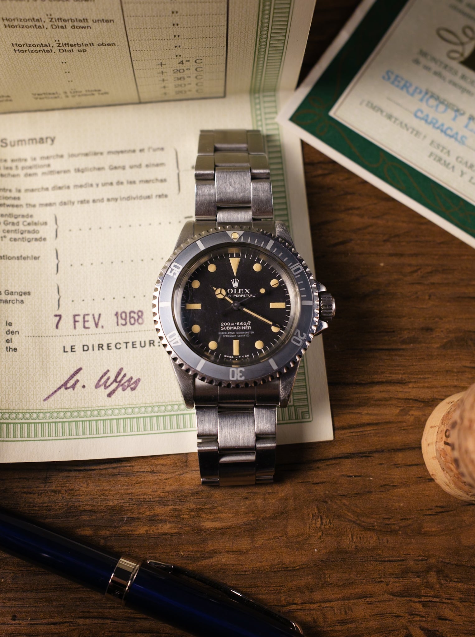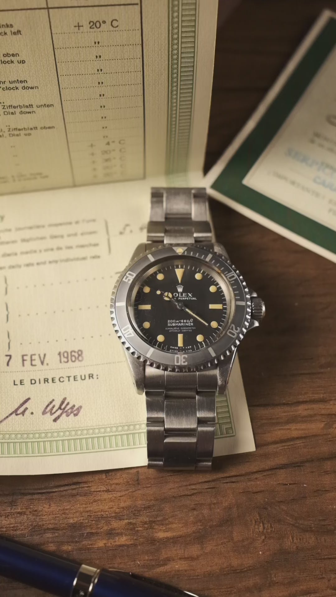 This watch has been professionally serviced by a certified watchmaker in August 2024 and keeps accurate time. It comes complete with the original 1960s “coffin” box and double papers, further enhancing its value as a rare and collectible piece.
