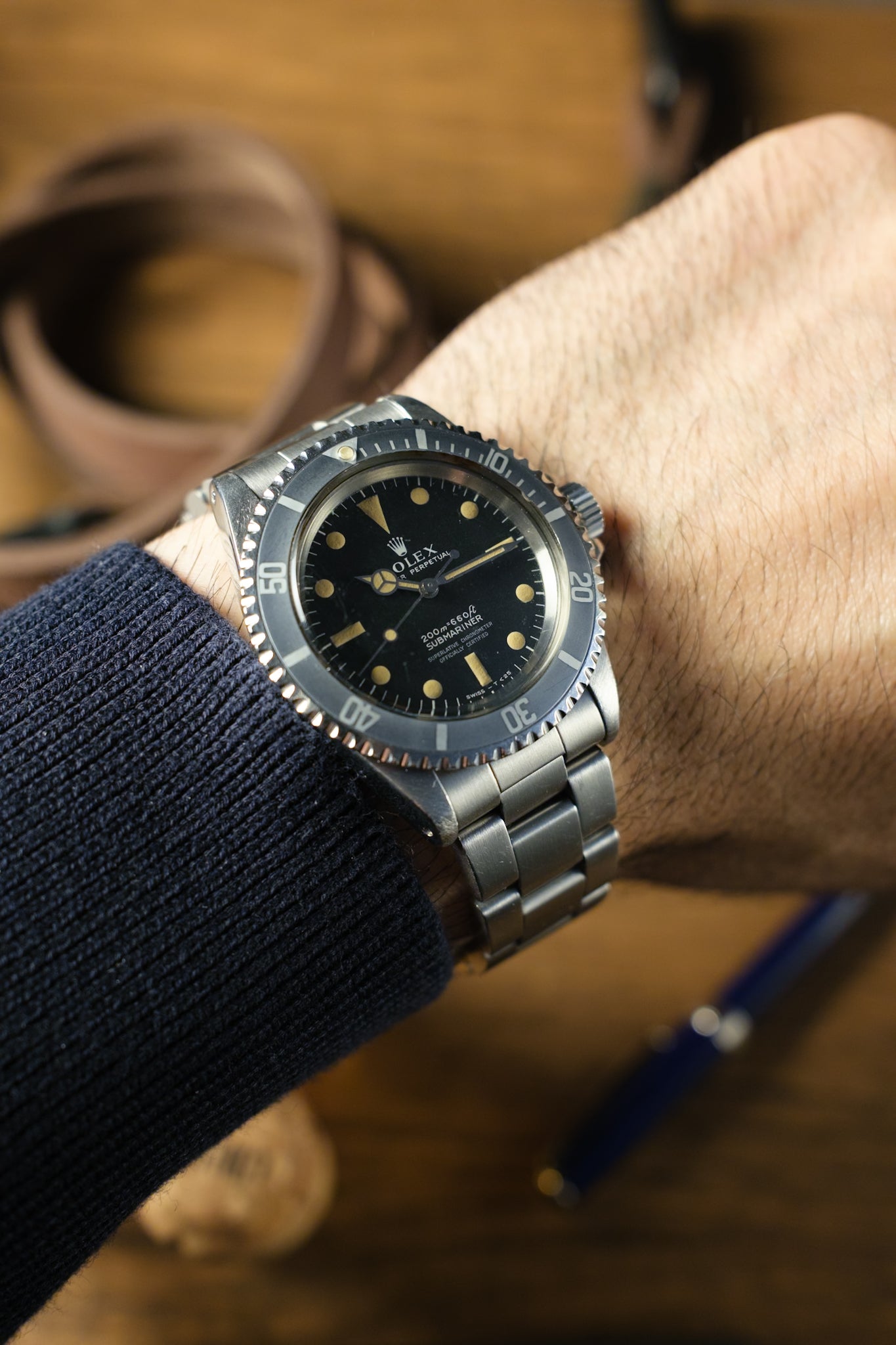 The Rolex Submariner 5512 Meters First is a highly sought-after vintage timepiece, cherished by collectors for its historical significance and exceptional design. This example boasts an original black dial with a stunning pumpkin patina on the indices, matched by original hands. The luminous material, believed to be zinc sulfide, was commonly applied in the 1960s before tritium became the standard in the following decade. The faded grey/blue “kissing 40” bezel insert adds to its charm, creating a unique aesthetic.