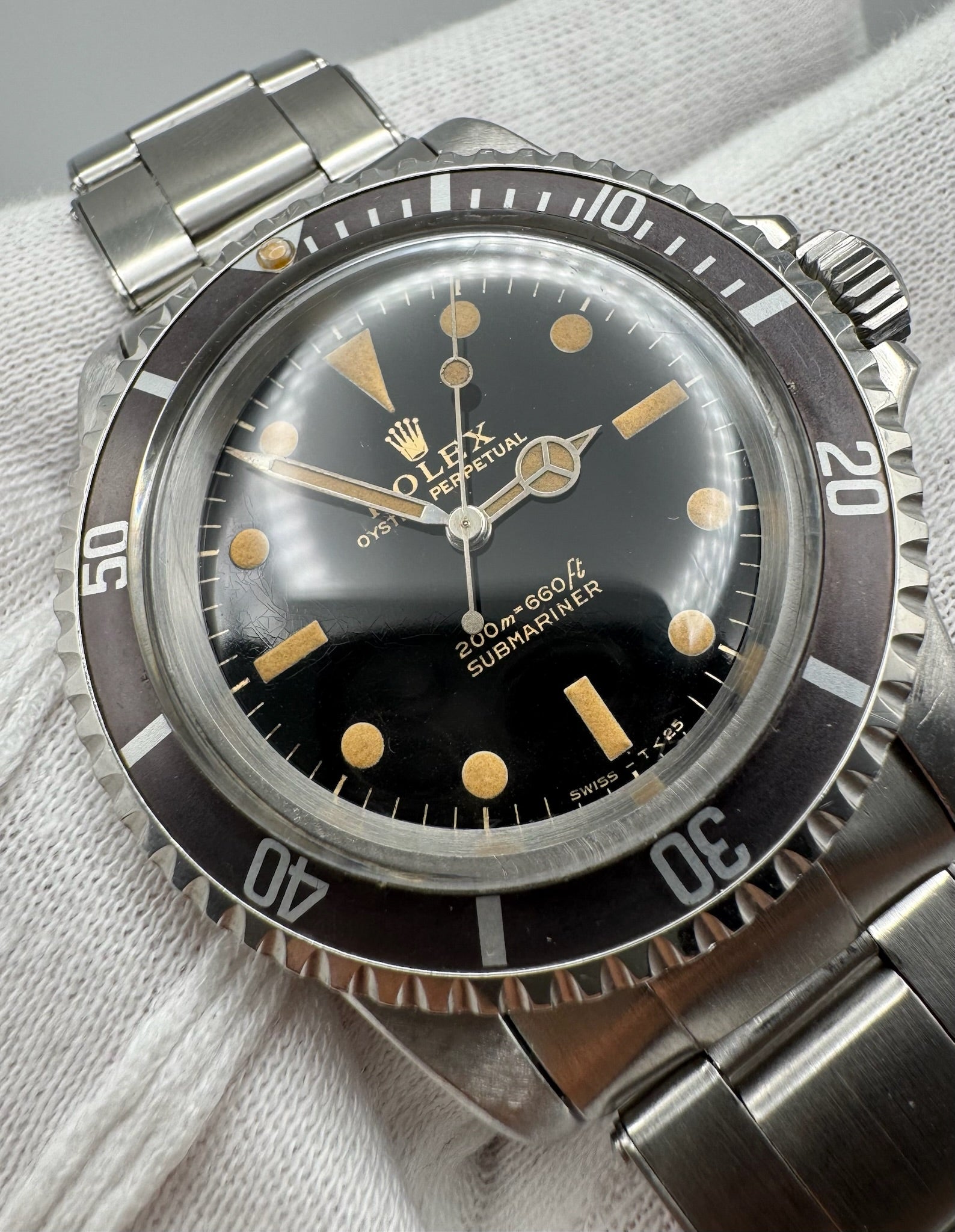 The stainless steel case appears to have been lightly polished in the past but maintains its factory-like finish, with thick lugs, sharp edges, and well-defined bevels. The original gilt dial is a standout feature, offering a deep mirror-like gloss that has aged beautifully. The zinc sulfide patina on the hour markers remains intact, creating a striking contrast against the dial, with matching hands completing the look. The watch is further enhanced by its tropical brown long 5 bezel insert, which has aged gracefully, adding to its unique character.