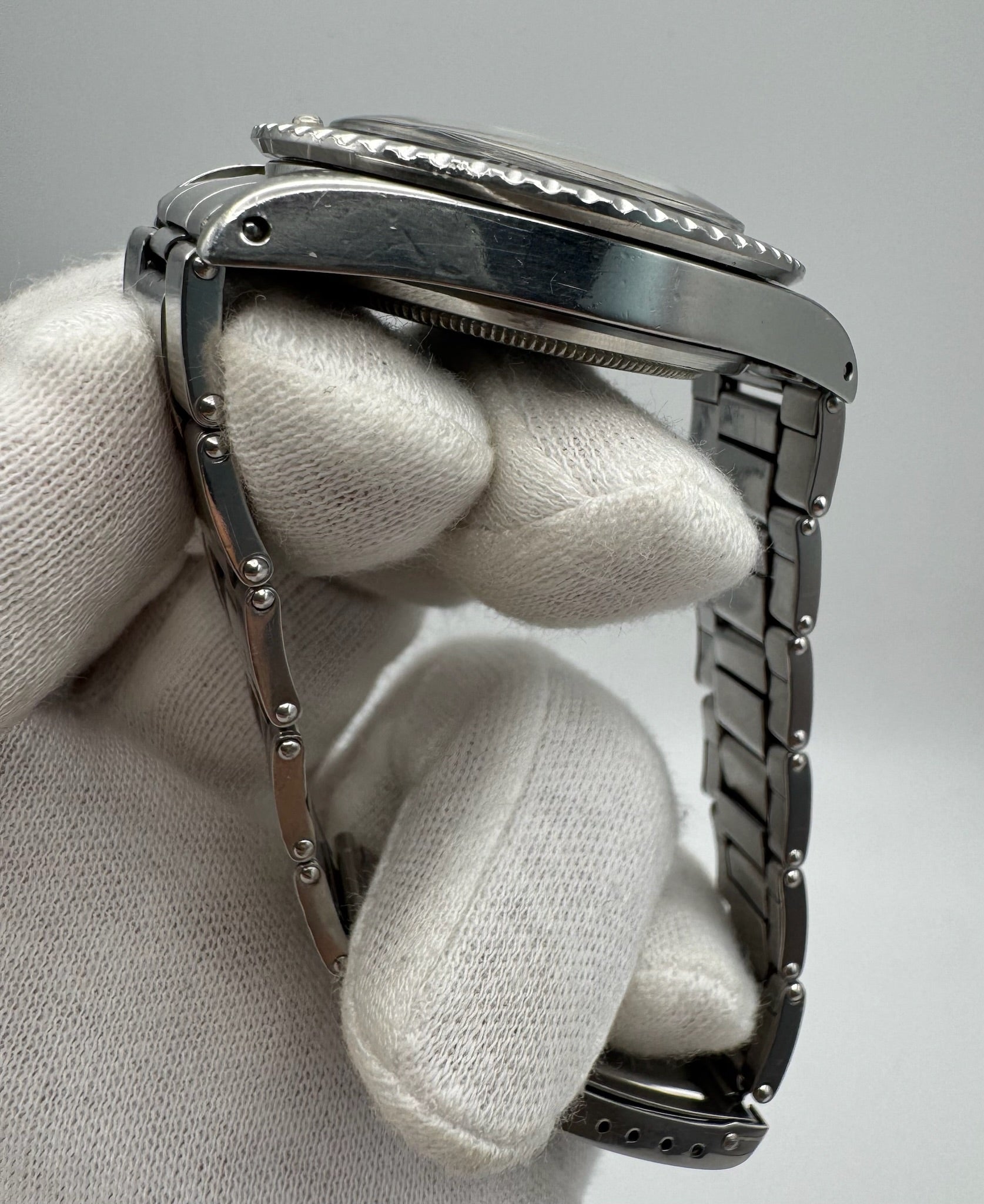 The stainless steel case shows signs of honest wear from years of use but maintains its original lines and proportions. A standout feature is the beautifully aged bezel insert, which has faded to a unique blue hue that complements the watch with a strong vintage presence.