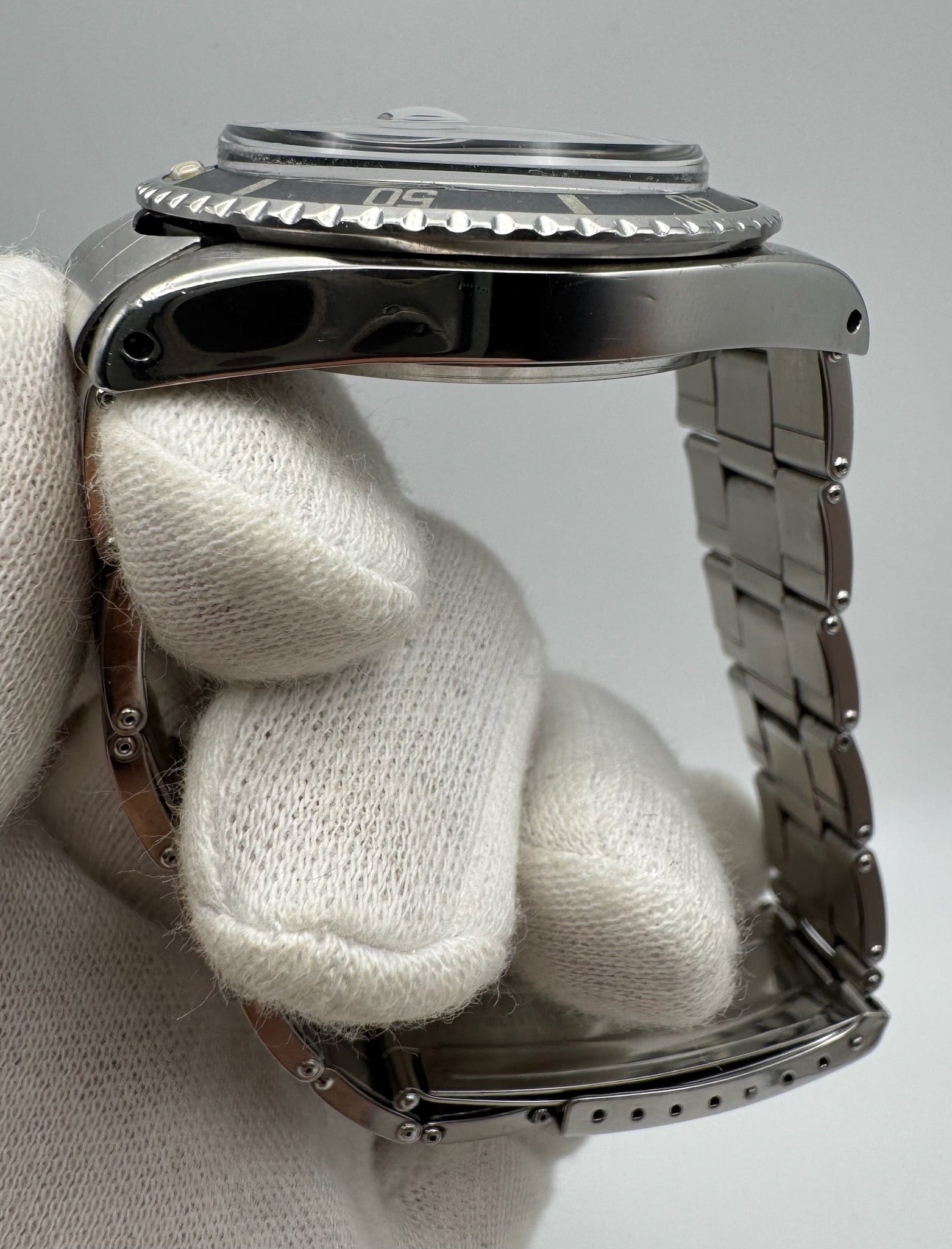 The standout feature is the original blue dial—remarkably well preserved for this reference. Unlike most examples that suffer from heavy paint degradation or bubbling, this dial is clean, with soft eggshell patina evenly covering the tritium hour markers. The hands match perfectly and still respond under UV light.