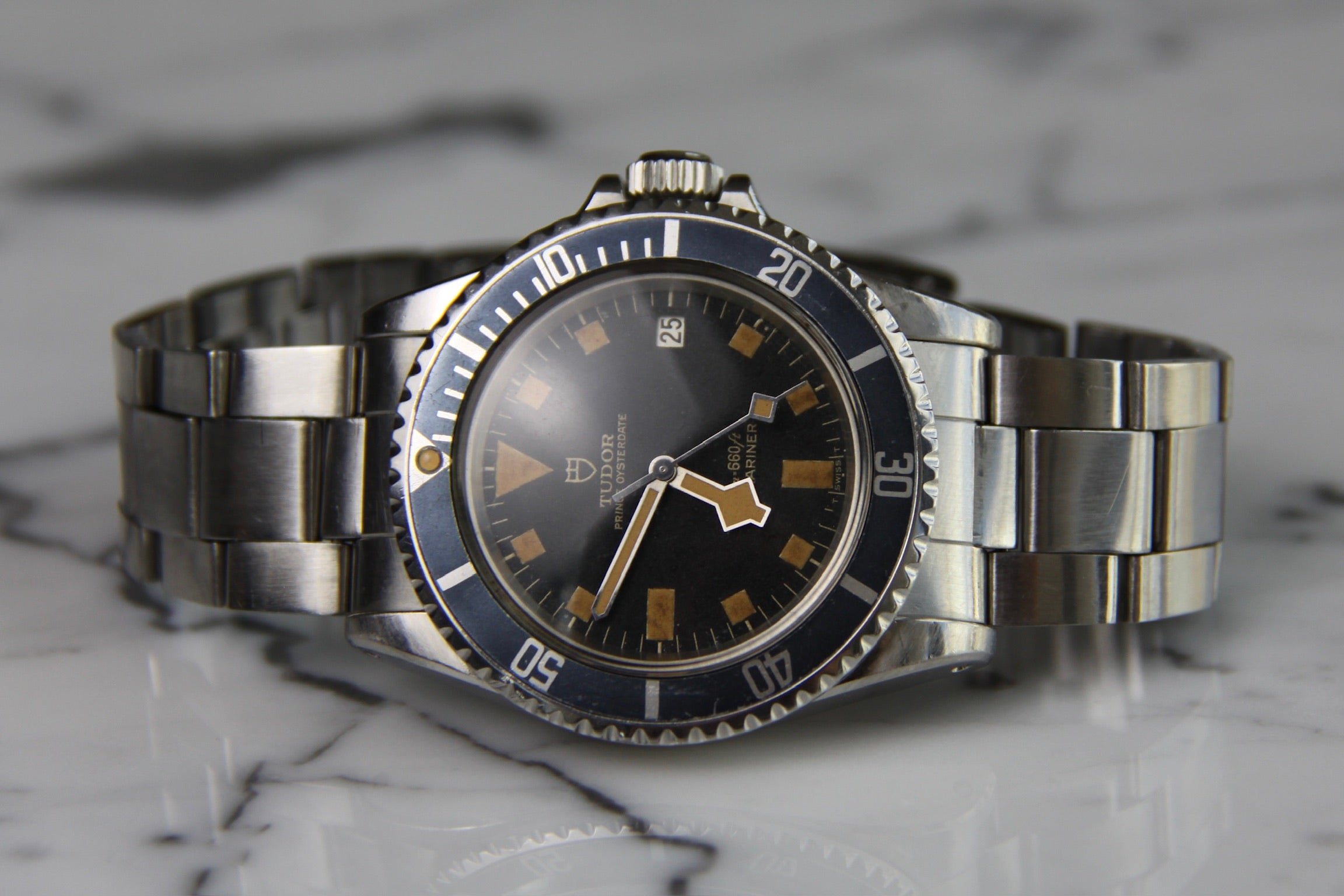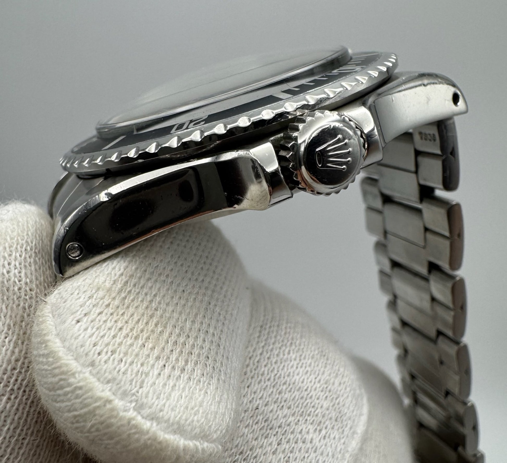 Its bezel insert has gracefully aged to a rich blueish tone that pairs beautifully with the dial, while the domed acrylic crystal—without the usual cyclops magnifier—is a rare and desirable variation. The original Oyster bracelet shows minimal stretch, a remarkable trait for a watch of this age, and includes 12 links.