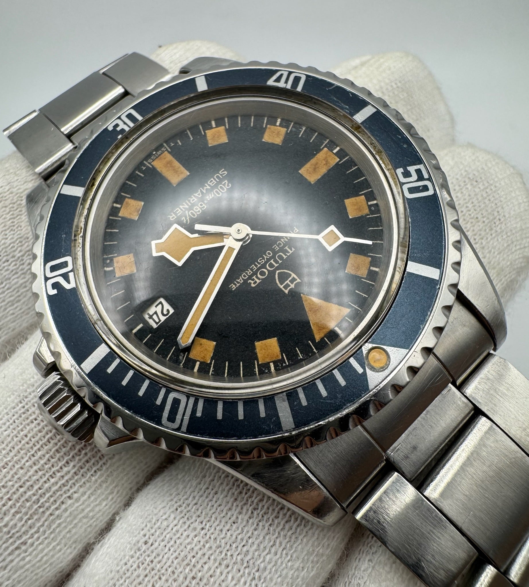 Tudor Submariner Snowflake Full Steel Black Pumpkin Patina Blue Insert Rare Confetti Dial 1968 (Unpolished/Serviced)