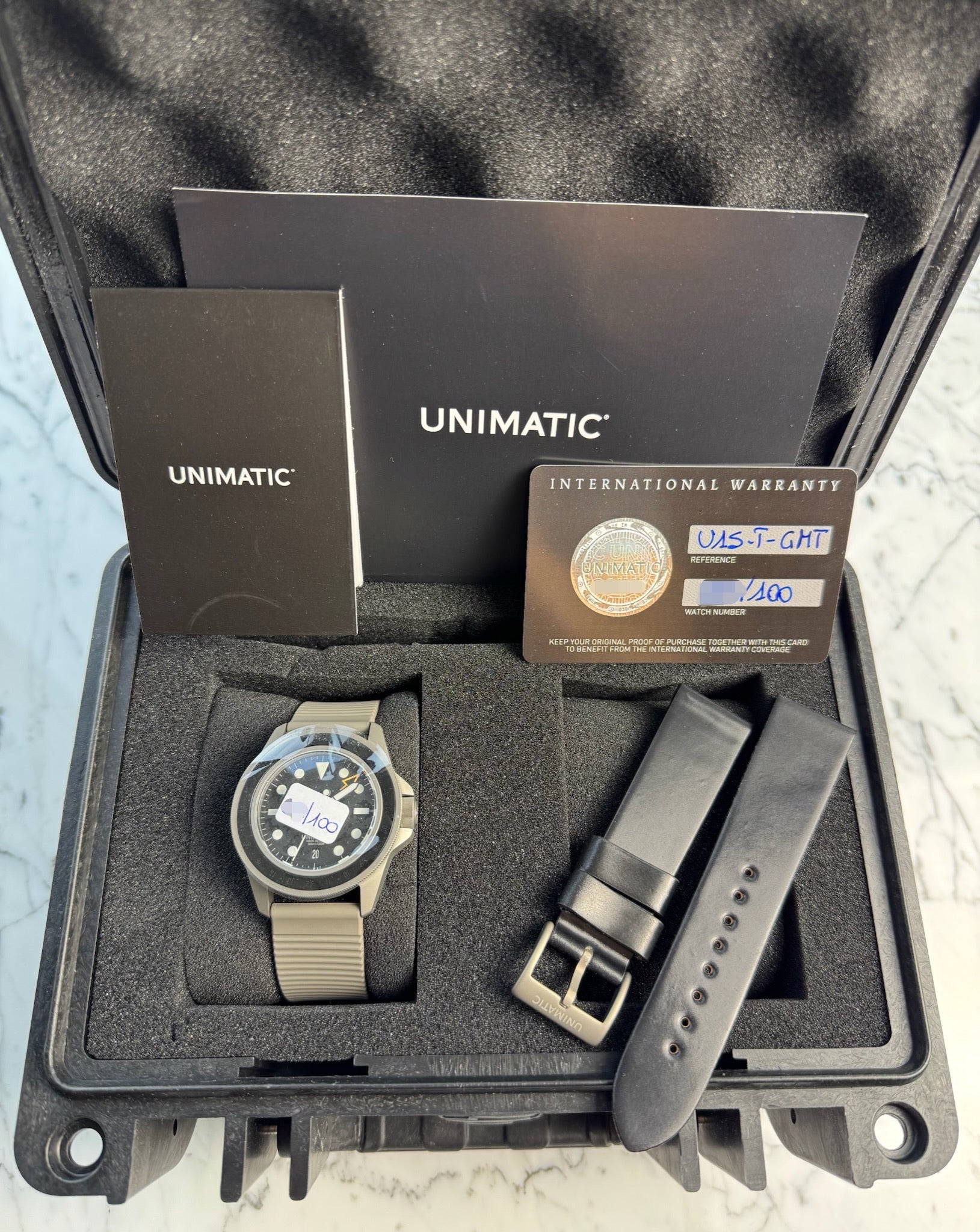 The watch comes complete with its original box and papers, along with an additional unworn black leather strap, making it a compelling opportunity for enthusiasts and collectors who appreciate Unimatic’s distinctive design language and scarce limited editions.
